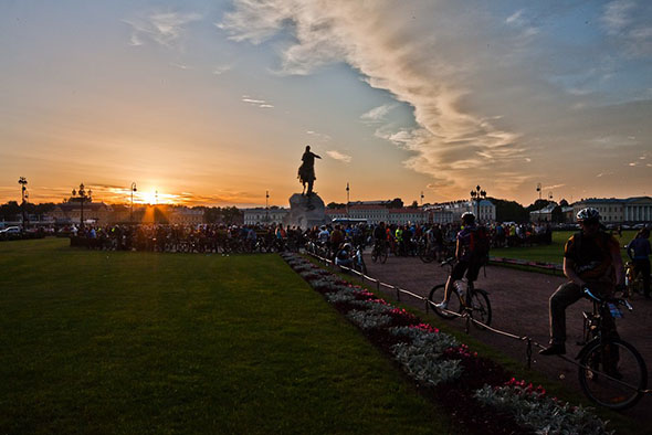 В субботу 27 июня в 22.00 у Медного всадника состоялось открытие ежегодного ночного велопробега «Белые ночи»! Традицию заложили еще в 60-ых годах прошлого века члены "старого клуба" - отделения велотуризма Санкт-Петербургского (Ленинградского) турклуба. Собирались велосипедисты, чтобы кататься по вечернему Ленинграду, любоваться тихими улицами и разведенными мостами. Маршруты всегда были разными, но в них сохранялась главная часть: проезд по ночному городу. В этом году колона в сопровождении ГИБДД проехала по маршруту от Галерной улицы до Петровской набережной. Но на этом приключения не закончились! Немного отдышавшись, велосипедисты отправились за новыми романтическими впечатлениями, но уже разными направлениями и группами. Самые энергичные и выносливые встретили восход утреннего солнца на берегу Финского залива и Ладожского озера.