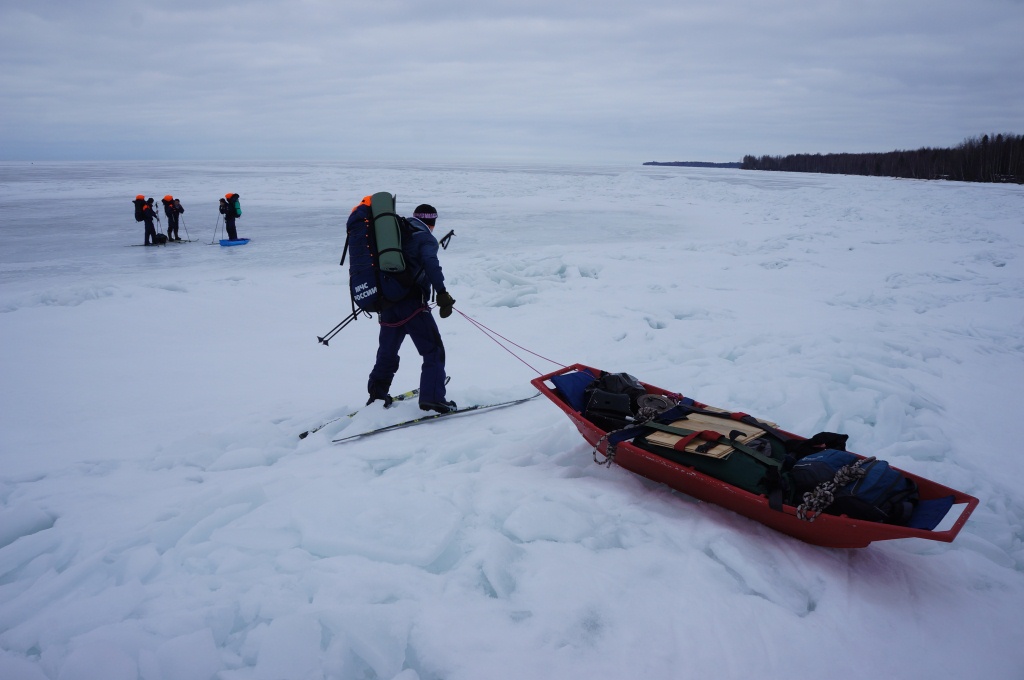 Теоретическая подготовка на базе МЧС в деревне Устье Вытегорского района Вологодской области завершилась трехдневным тренировочным выходом на лыжах с полевыми ночлегами на льду Онежского озера в прилегающих лесах. Преодоление различных форм естественного рельефа (торосы, голый лед, заструги, лесотундра) чередовалось с отработкой навыков ориентирования, транспортировки условно пострадавшего и организации временной вертолетной площадки.