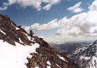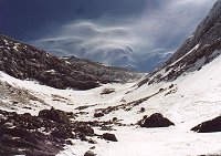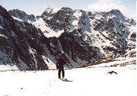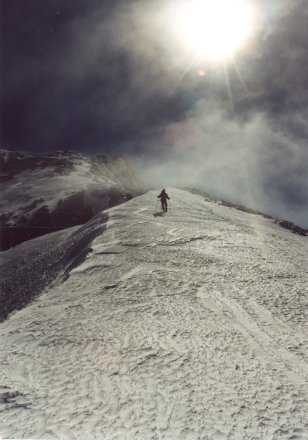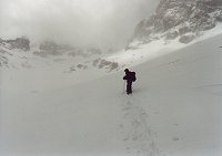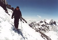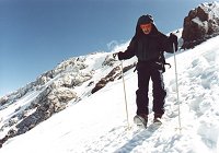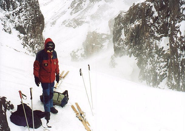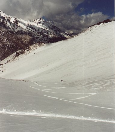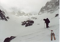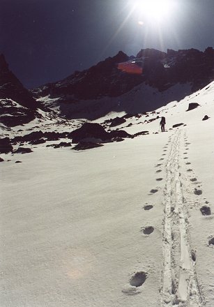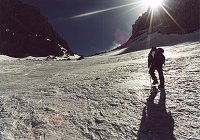 Показательно, что большая часть подъема на Северное Седло проходится на лыжах. Перехватив на подъеме горяченького, ничуть о том не пожалели. На седле - то оказались в 15-30, а в 16-00 начали спуск по левому из двух кулуаров. Текст описания гласит: "первые сто метров спускаемся в кошках, а далее приятное классическое катание." Ну, в общем, это ложь. Нам пришлось спускаться спиной вперед на три такта с ледорубом и по одному, озираясь постоянно. Уж больно много свежего снега лежало в кулуаре, что, будучи помноженным на изрядную крутизну, заставляло размышлять о бренности бытия. А после минимум трех сотен метров спуска мысль о лыжах так к нам и не пришла. Покрытые снегом моренные валы, бараньи лбы, натечные льды потребовали ходьбы пешком, выискивания путей прохода и поглядывания на часы.