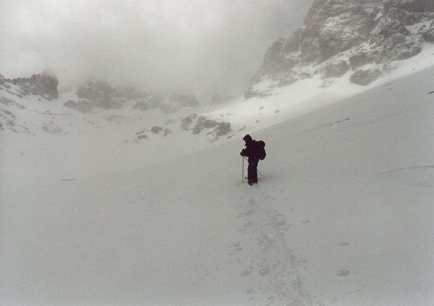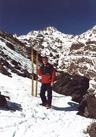 Он выпал ночью. Минус Цельсия пришел вместе с закатом и не уходил до самого утра. Теперь все вокруг похоже на Киргизский Тянь-Шань: узкость долин в сочетании с изрядными перепадами высот прикрыта свежим снегом, который, правда, не позволяет скользить. Но виднеются снега и посерьезнее - те, что лежат тут с поры больших снегопадов. Заструги, надувы, фирн - все это совсем рядом. После обеда приступаем к реальному лыжингу. Закрепившись на рубеже "хижина Тубкаль", заскользили!!! Начавшаяся метель придает пикантности всему вокруг, какая уж тут Африка! Хибины, Тува, Урал - вот это что. Попытка с высоты 3207 подняться на седловину Tizi-n-Ouagane, 3750 была остановлена откровенной невидимостью, снегом и ветром переменной силы. Но удовольствие от катания вниз получили полноценное, хоть к ногам пристегнуты некантованные лыжи "Турист". Главное не провалиться в каньон, что проступает то там, то сям в средней части висячей долины.