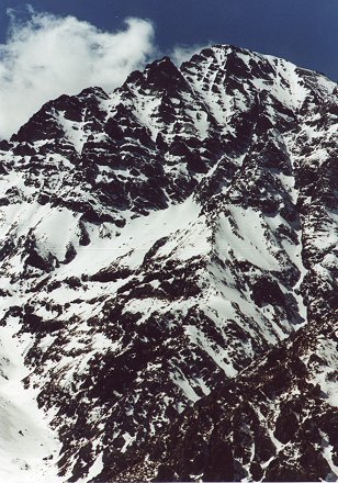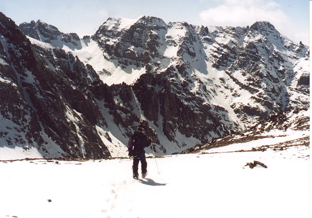 То есть азибы. С мая в них кипит жизнь скотоводов, а сегодня никого. Фото в стиле: "Я и убежище" не потребовало много времени, а дальше снова вверх. Склон южный, а значит без лыж. Чтобы не было обидно, разглядываем самый фундаментальный вид восточной стены Тубкаля. Это производит правильное впечатление. От подножия до вершины больше километра камней и снега. А с расстояния около двух километров запоминается надолго.