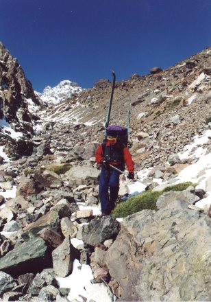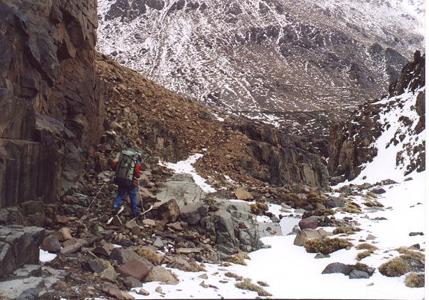 Опять посетила сушь. Великая сушь наступит завтра, а сегодня идется не так уж печально. Вскипятили, глотнули и на седловину Tizi-n-Ounrar, 3300. На той стороне снегу море! Будет полуторачасовой спуск в лучших лыжных традициях, будет и раздолье склонов, и приятный каньон, и не будет ни подлипа, ни ядреного наста. От края снегов до Аzib Tifni останется полчаса пешком. Азиб снова необитаем, а значит, никто не даст совета, есть ли непроходимый прижим впереди. А вот справа вверх идет вроде бы тропа, ну-ка туда! Оказалось зря - перепредохранились, тут прижима нет.