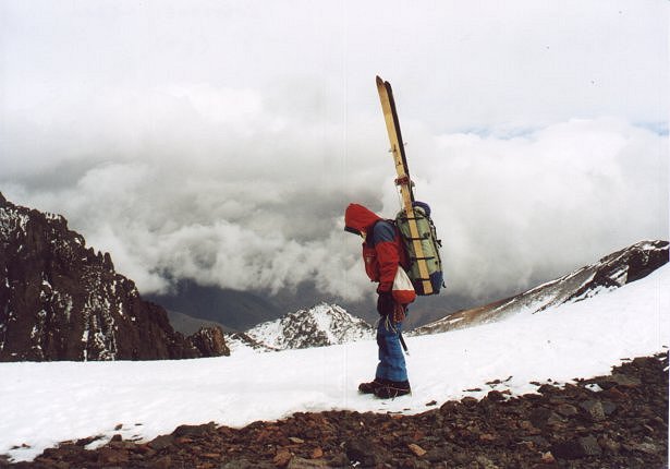За полтора часа домчали до границы снегов. Орлов продержался на двести метров дольше, взял приз за упрямство и за волю к победе. Когда приполз и я, на нетвердых ногах с первой пары лыж уже были сняты крепления. Одно из самых приятных мгновений - постройка пирамиды из лыж, отслуживших свое за 14 лет, и начертание почти традиционной надписи: "Вадик и Женя здесь были".