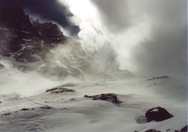 Даже те, кто решился на прогулки в непогоду, не могли толком сопротивляться царившему в хижине унынию. Люди привыкли залезать на Тубкаль с наскока, а ветер хоть с ног и не валит, а куда идти не видно. Мы то - ребята, закаленные ноябрьским Казбеком, знаем, что гору можно высидеть. Да и время нас пока не поджимает. Иное дело - клиенты и гиды: вина вечерком попили, пошумели, послушали народные берберские завывания и долго еще бубнили, лежа на нарах, про погоду, восхождение и деньги.