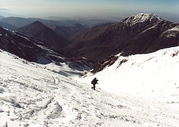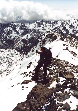 Два с половиной часа шустрого движения увенчаны абсолютным спокойствием атмосферы на вершине. Редкостная по прелести погода - это явная награда за терпение и упрямство. Видно все и всюду. Там вот предгорья и Марракеш, тут угадывается начало Сахары, а там за массивом Ras-n-Ounoukrim, метрах в 4167 ниже должен быть Атлантический Океан. Подробная обсервация показывает, что карту можно привязать к местности и обнаружить наиболее характерные ориентиры в виде Dome d Ifni, Imouzzer, Biiguinnoussene. Но главное, что путь спуска с Col du Nord в сторону Tissaldai хоть и крутоват, но на взгляд вполне приемлем. Так утверждается решение о траверсе через Северное Седло и последующем сквозном прохождении его же. Если траверс сегодня, то перевал - с мешками завтра.