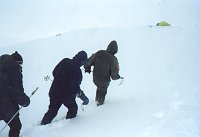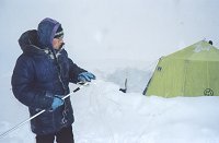 По мере усиления ветра закрадываются понятные сомнения в прочности не только стенки, но и каркасного шатра. Построили, растянули, закрепили все, что можно, забрались внутрь. Звук умирающего шатра описать буквами не удается. Удается вскочить и вцепиться в каркас, палатку, лыжи. Вообще-то, этот шатер ломало только один раз - в феврале вблизи перевала Зимовщиков, что на Памире. Там высота другая - без малого шесть километров, а здесь то в десять раз меньше! Второй парадокс в том, что температура повышается! Сейчас +4С, и вместо снега идет дождь.