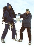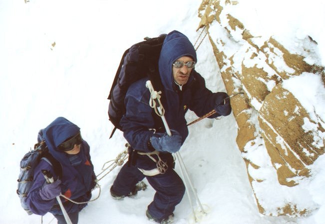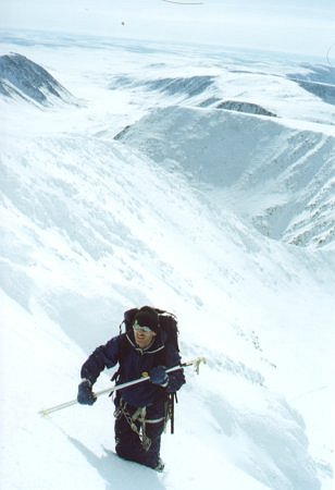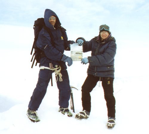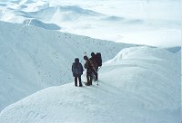 Вообще-то с седловины на вершину Пайера ведет маршрут 2А, но сначала он кажется послабее. Однако задора хватает минут на сорок одновременного движения. В 150 метрах от предвершинного гребня вешаем-таки веревку. Все по-честному: закладки, скальный крюк, скальная (!) проушина, компенсирущая петля. После веревки все зависит только от вестибулярного аппарата, если, конечно, не дует. В 13:15 на вершине. Видно все: там Восточно-Сибирская Низменность, а здесь Большеземельская Тундра. К северу и югу Уральский хребет, совсем на хребет непохожий. Но пора назад, еще ждет спуск к седловине и некий ригель в стиле "сначала круто, потом выполаживается". Без расслаба. Видно все меньше и меньше, достопримечательный 160 метровый ледопад на ригеле просматривается только в верхней части. А жаль. Вот и то место, где река становится рекой. Это Левая Пайера. Долина завалена никем не упорядоченными скальными останцами. Здесь оправданно посещает the great feeling of remotness*. Диковатенько. Ветер опять усиливается, но стенок надменно не строили. Обошлось...