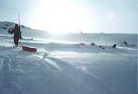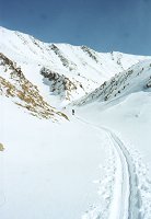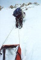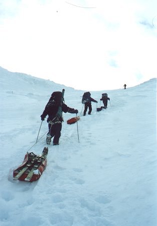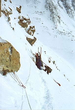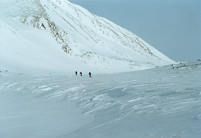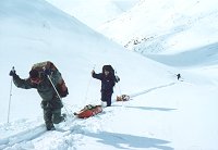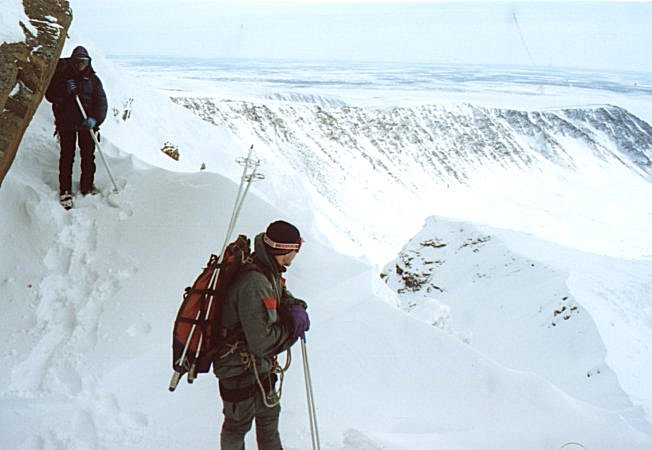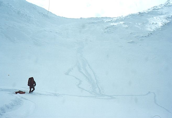 15 апреля. 8:40. Иногда что-то видно. По крайней мере, можно собираться. Всяко надо дойти до перевального цирка, а там посмотрим. Против пурги идти противно, но возможно. Через 20 минут обернулся и, о, ужас! У всех левые полумордия фарфорово-белые! Слава богу, запаслись пеномасками. В масках придется идти полтора часа, а затем ветер неожиданно успокоится. Это будет под самым перевалом. На него придется подниматься 5 часов, а так и не скажешь. На первый взгляд всего-то метров триста по вертикали. Тактика понятная: двумя подмножествами от скального выхода до скального выхода, прямо вверх, главное не рыть окоп перед собой, а пытаться эти снега трамбовать. Глубина тропления до "по шею". Так вот и идем. С волокушами... Участок траверса в полверевки заставляет эту самую веревку достать и повесить. Достаем и вешаем. С волокушами... Вешаем и проходим по перилам. С волокушами... Снимаем и выходим на седловину. С волокушами... Это какой-то психоз. Без волокуш в этом походе вообще не перемещались, а ведь не хотели брать! Спуск ожидался проще. Так и вышло. Приключений не было, кроме падения Шуры с берега озера. Медленно, с оттяжкой, сквозь толщу снега и льда. Мокро, но не смертельно. А так - достойное лыжное катание по подготовленным склонам. Типичный пример лыжного туризма.