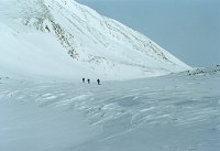 14 апреля. Опять пурга. Это неприемлимо. Здесь Азия, нам скоро назад в Европу. Если прямо вниз, то ближайшее поселение - это Лохподгорт (нечто на берегу Оби в 84 километрах), который нам очень не нравится. Особенно с пометкой "нежил". Но движемся вниз, не назад же. А в 10:30 метель исчезает, зато появляется странный ракурс перевала Успешный Проход. Говорят, его кто-то когда-то проходил не то по самому правому руслу перевального ручья, не то по вешкам, идущим от балков на плато. Мы же по-крестьянски: как видим, так и идем. Получилось по самому левому и никаких вешек. Да и ладно. Печально то, что верховья целый день закрыты облаками. Что-то будет завтра? А сегодня надо и спуститься в Лек-Хойлу и подойти к перевалу Восточно-Пайерский. В 15:30 спустились, а в 19:15 подошли. Здесь неуютно. Почти нет снега - только печальный лед, в который не лезет почти ничего из того, на чем принято крепить палатки в культурных местах. Ясно дело - и стенку строить не из чего. А дует, и как! Все, что имелось было засунуто в снего-лед, все петли и веревочки, зафиксированы на том, что было засунуто. Но спокойствие не приходило. В ответ на буйство природы было выдвинуто дополнительное приспособление - привязанные изнутри петли самостраховки, которые проложили под обитателями. По мысли инженера проекта именно эта система должна была не дать шатру улететь в сторону Лохподгорта самостоятельно. В любом случае психологический эффект сугубо позитивный. Спалось неплохо. Некоторые под утро признались, что сквозь сновидения за веревку все-таки хватались.