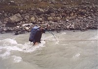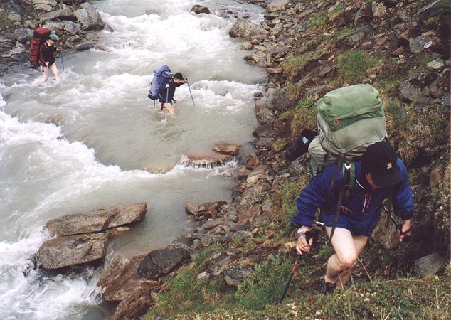 Сегодня горы напомнили о технике безопасности. Это была лишь переправа, но какая! Высоких и тяжелых ноги еще выносили, а мелких и легких пришлось страховать веревкой. Когда ноги страхуемого отрываются от земли, начинается флотация по полной схеме: с широко раскрытыми глазами, криками и счастливым концом.