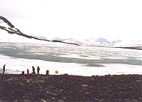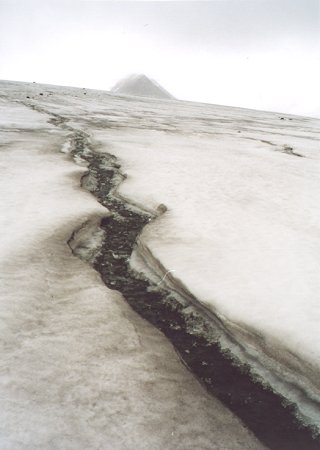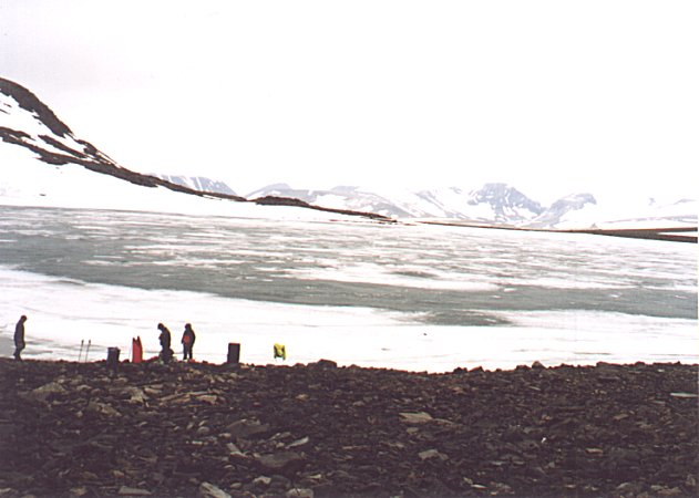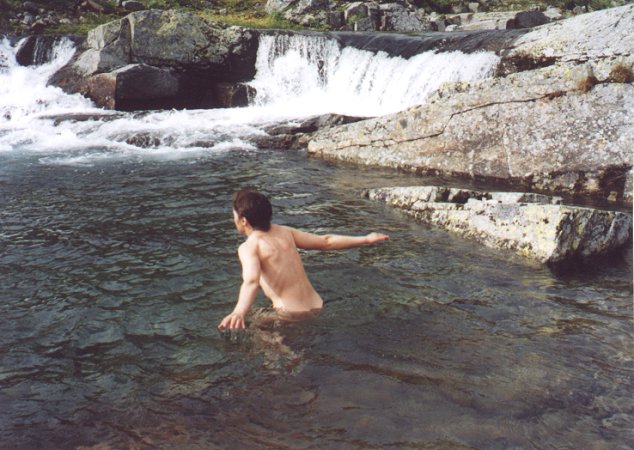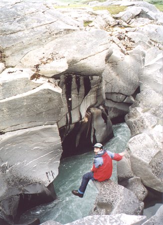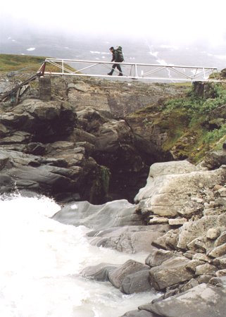 Теперь вниз мимо ледового озера в направлении плато Luohttalahko. Так мы срежем угол и попробуем избежать заведомо опасной переправы через Sarvesjahka. Наиболее изящным считается перескок в каньоне. Чуть позже каньон будет обнаружен, однако, на перескок никто не решился. Уж больно зализанные формы и зверский расход воды, хоть и зазор не более метра.