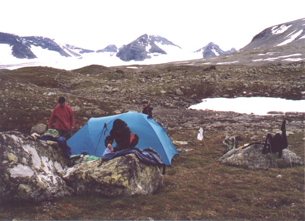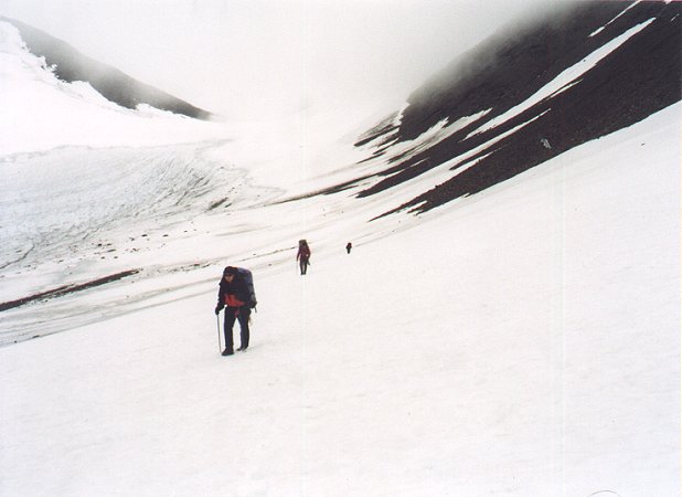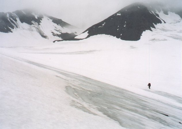 Но сегодня лишь пара седловин и только-то. Облачность стоит ровненько по их уровню, а подниматься на гору за ради голого спорта безо всяких шансов окинуть взором округу никого не привлекло. Довольствовались необычностью форм седловины между Kanalberget и Sadelberget. Гигантский снежно-ледовый надув такой причудливой формы прежде никто еще не встречал. Весьма живописно, даже в дождь.
