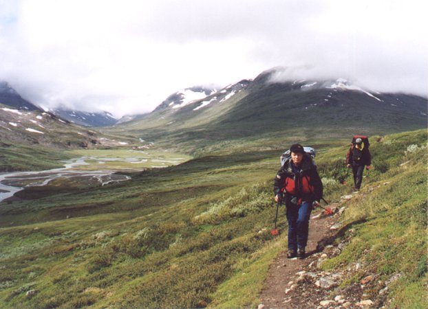 Путь назад в Kvikjokk приятен, несмотря на туман, неизбежный набор высоты и падение в погоне за грибом. Огласили окрестности пением популярных отечественных песен по случаю святому - дня рождения на маршруте. Хай живе, Витя! Любопытен вопрос соседей по ночлегу: Are you from Russia? Молодцы! Догадались! Знай наших!