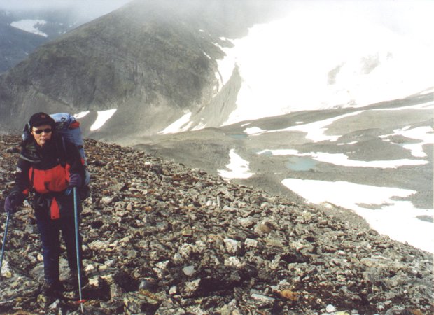 Путь выше по течению в обход Ridatjahkka избавил нас от заведомо печального продирания через мокрые заросли в долине Fadanjunjesjagasj. На одну седловину больше - это вовсе не значит на одну седловину хуже. Здесь все перевалы похожи на 1Б: осыпи, снег, выход на ледник, перевальный взлет, просторная седловина. Горизонтали на карте не врут - почти все читается с листа.
