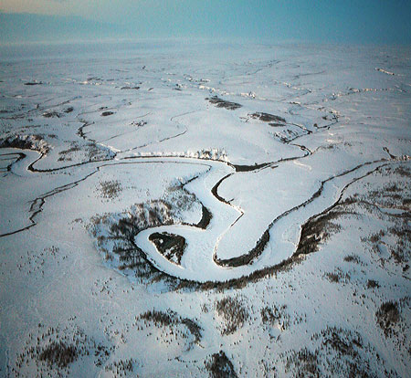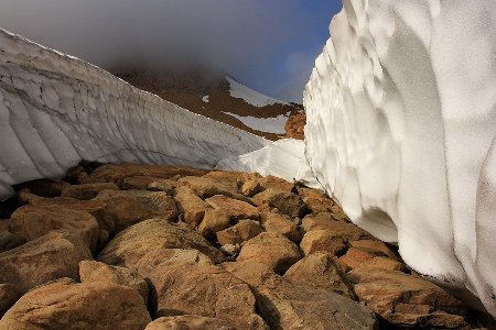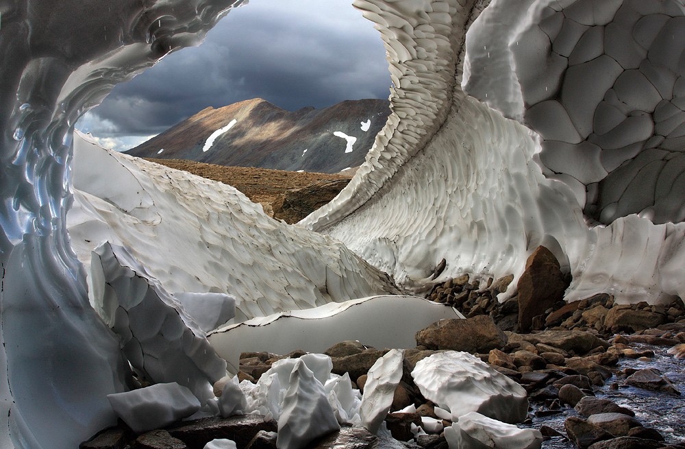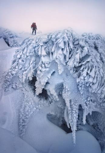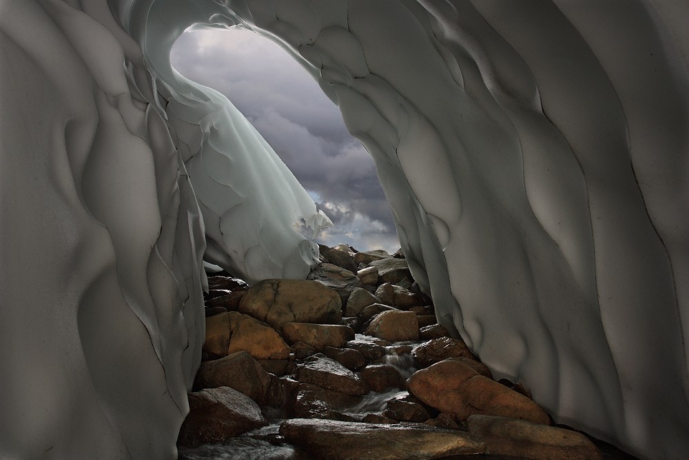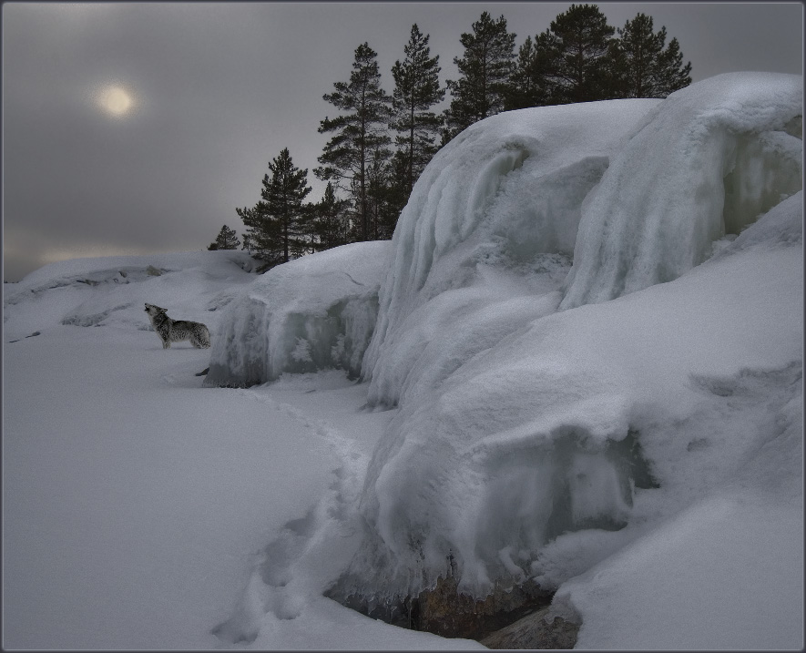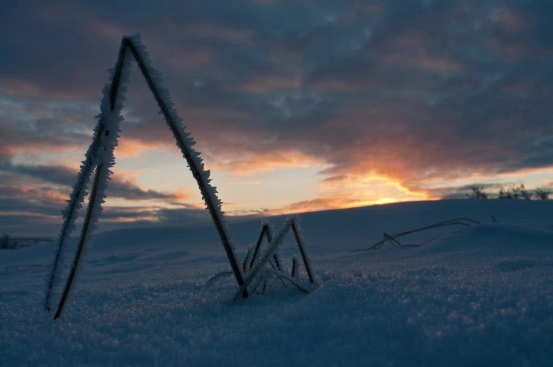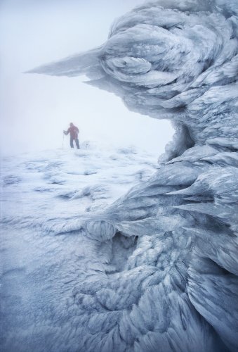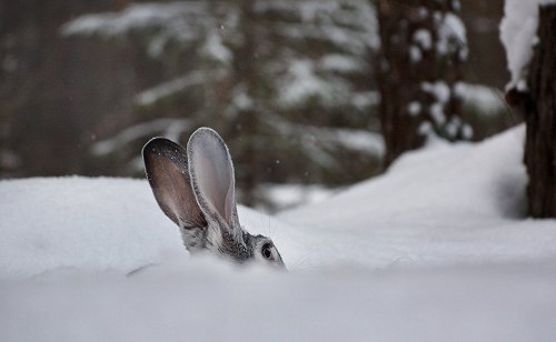 Еще не до конца сменивший шерстку заяц высовывается из снега. Снег выпал несколько дней назад и для зайца он видно в диковинку.«Ледяной прибой»