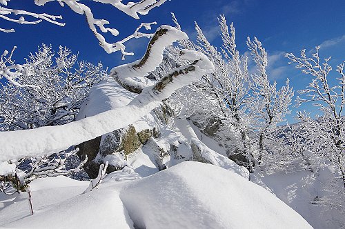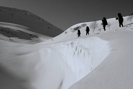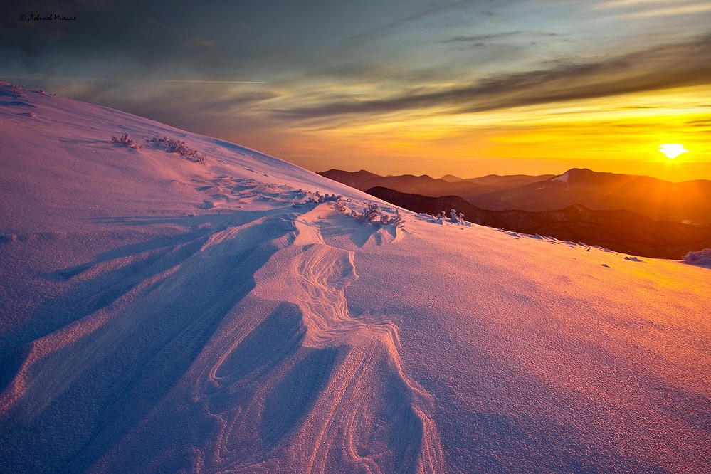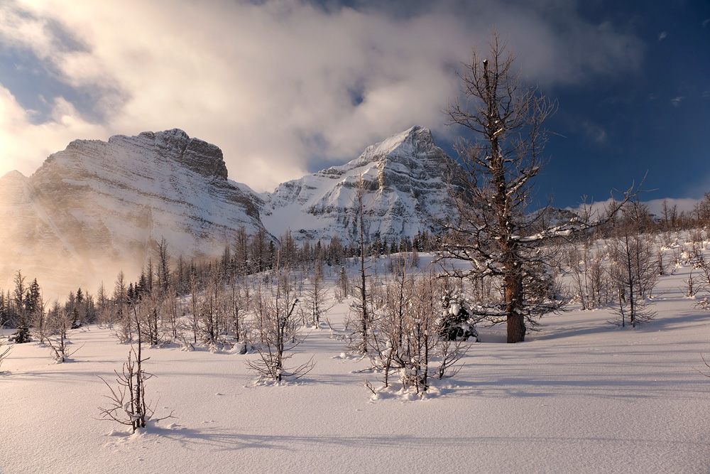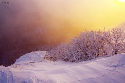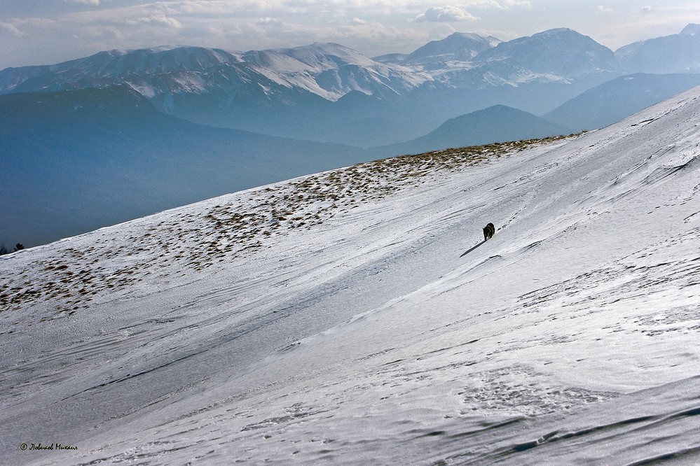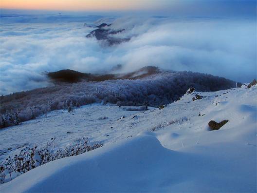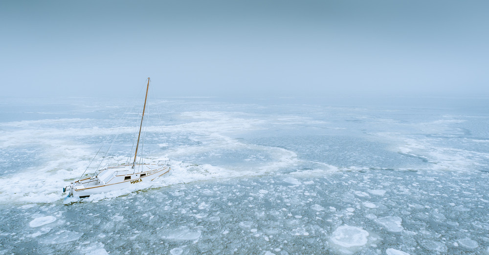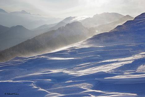 Еще не до конца сменивший шерстку заяц высовывается из снега. Снег выпал несколько дней назад и для зайца он видно в диковинку.«Ледяной прибой»