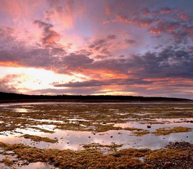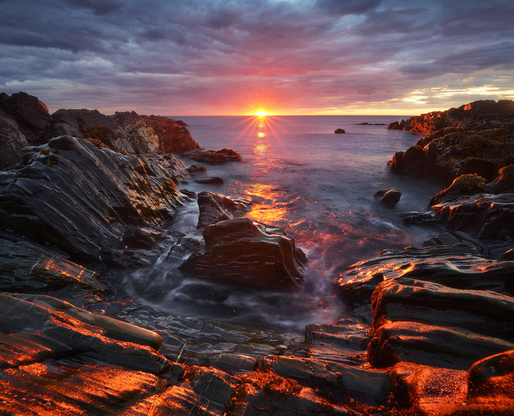 В августе 2016г, в одиночном 10-ти дневном путешествии по полуострову Рыбачий я исследовал скалистые берега на "фото-пригодность". Этот рассвет природа подарила неожиданно, когда я уже хотел уходить в лагерь на горизонте образовалась щель в плотной стене облаков, солнце выглянуло и одарило одним из самых красивых рассветов, камни оголившиеся на отливе засияли словно лампочки. Близ мыса Немецкий