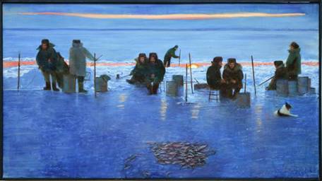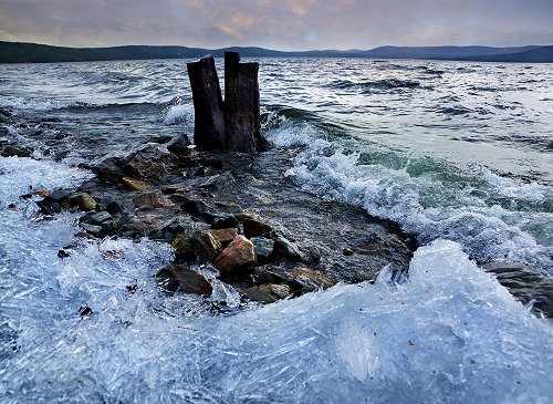 Лед, сковывавший озеро долгую зиму, наконец-то треснул и стал разбиваться на прозрачные ледяные иглы. Они усыпали все побережье, и волны проснувшегося озера с шумом разбивали и ломали их о камни.«Утро на реке сказок»