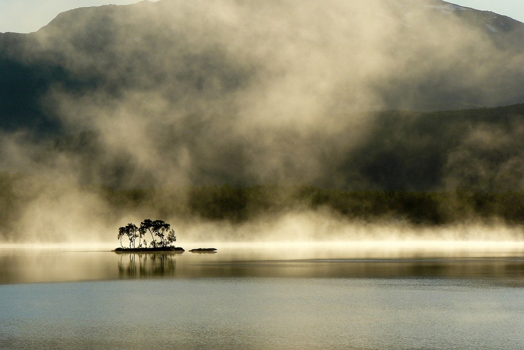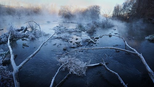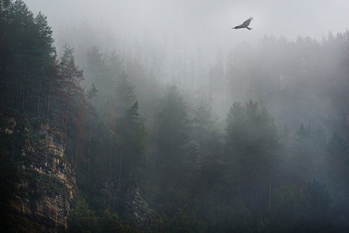 Утро – всё заволокло туманом. На протяжении всей ночи шел крупный дождь и небо, видно, извергнув на землю свои запасы, успокоилось только к утру. Я проснулся за час до рассвета и ходил вдоль реки, выбирая удачный ракурс для будущего кадра. Мои ожидания чего-то волшебного оправдались. Из-за гор стало проглядывать долгожданное Солнце и все кругом разом запело, жизнь как будто ждала сигнала и вот оно свершилось. Туман клочьями сходил с гор, летал над просторами бурной реки, а в реке плавала рыба. Она привлекла все внимание крылатого хищника – коршуна, который неторопливо летал над рекой, высматривая добычу.А я все снимал и снимал. И это волшебное утро мне не забыть уже никогда.
