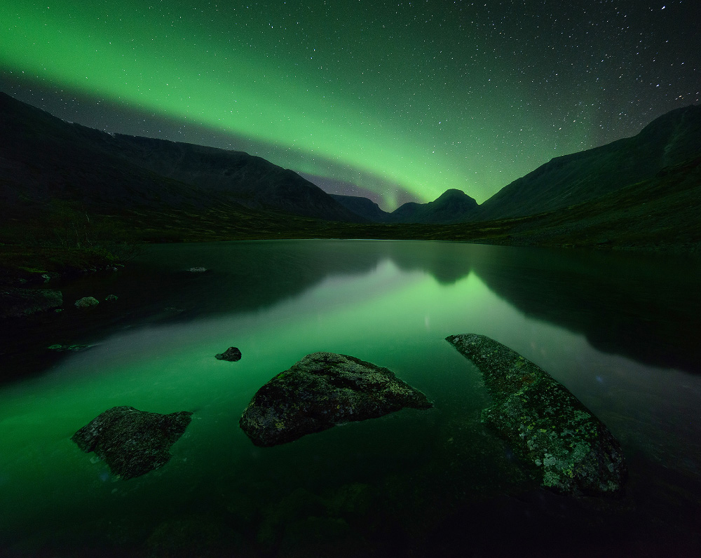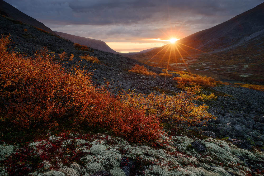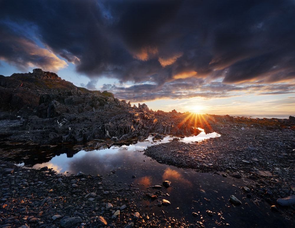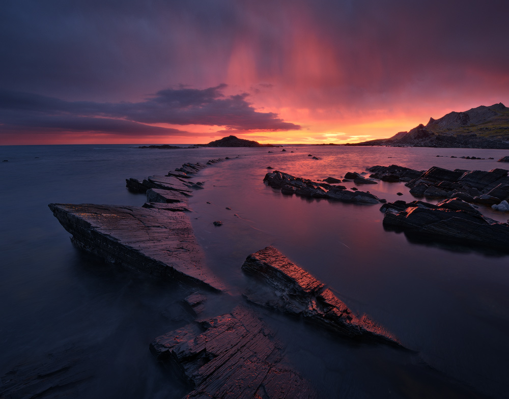 Выглянув из палатки этим утром, захотелось сразу же забраться обратно и укутаться в теплый спальник, все было вокруг серым, моросил дождь и вроде бы никаких намеков на красивый свет. Но что-то внутри говорило об обратном. Камни на переднем плане в прилив почти полностью скрываются под воду и это было большим везением, что во время рассвета уровень моря был таким как нужно. Стоит упомянуть про усиливающийся дождь в самый пик рассвета, после каждого кадра приходилось протирать линзу объектива и это очень дестабилизировало, хотелось спрятать поскорее камеру и где-нибудь. Мурманская обл, полуостров Рыбачий, мыс Кекурский