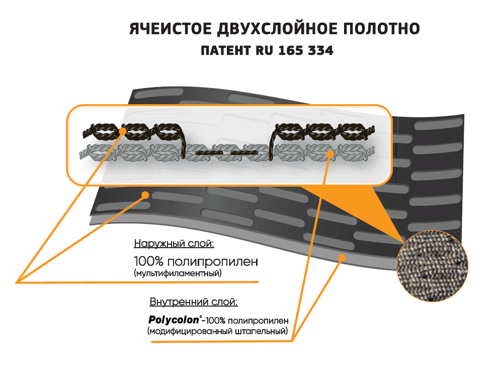 Использование гидрофобной полипропеленовой пряжи на изнаночной стороне и нитей на лицевой стороне совместно со структурой полотна обеспечивает повышение его теплозащитных свойств. Существенным отличием является отсутствие пилинга на лицевой стороне. Применяется в двухслойном кинетическом белье. Технические преимущества запатентованного полотна наиболее заметны при жесткой эксплуатации.